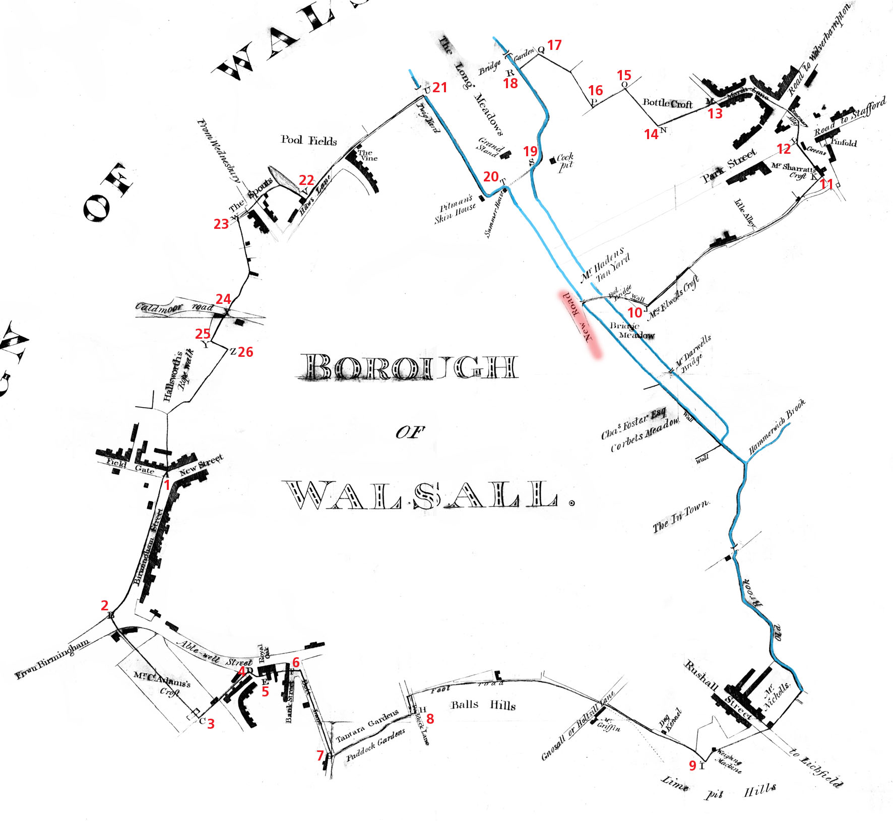 The boundary begins at point 1 and cuts across Field Gate and proceeds down Birmingham Street. Occupiers of the properties around this first point are, Thomas Wilcox, a plater of New Street, the Widow Tittensor’s dwelling that is occupied by Thomas Thacker. Proceeding down Birmingham Street point 2 is reached and described as Birmingham and Walsall Turnpike Road, on turning left, the yard, warehouse and garden of William Spurrier is passed, continuing down this route one approaches the croft and field of Charles Adams, passing a pond at the end of the field, by a brick wall is point number 3. Turning left at this point, a watercourse flows on your left and between the buildings known as Latchford’s Buildings. At this point there were several dwellings one occupied by Henry Saunders and a manufactory once known as Heptenstalls but now known as Parker’s File Manufactory. Proceeding along this line of buildings point 4 is reached where a right turn is made and the boundary continues at the rear of the premises occupied by Joseph Middleton, the Royal Oak (a Royal Oak still occupies the site today), point 5. The boundary continues at the back of a house occupied by a Mrs Bridget Harvey, it crosses Bank Street and then turns right and runs up the middle of Bott Lane until it reaches point 7 at the wonderfully named Tantarra Gardens on the left and the equally exotically titled Paddock Gardens on the right. A left turn at point 8 meets Paddock Lane where a right turn is made along what is called a foot road which is Balls Hills, it continues along, curving to the right, until Gnosall or Holtsill Lane is crossed with the lime master Joseph Griffin’s house and buildings on the right. The foot road continues past buildings known as the Dog Kennel (this housed the hounds for the hunt) to point 9 on Limepit Hills so-called possibly because of Mr Griffin’s excavations! Before passing the house of John Walhouse the weighing machine is to be found on the left side of the road. A short distance further Rushall Street is crossed where the boundary continues along a watercourse and by the side of the gardens of William Nicholls, at the end of this garden the boundary turns sharp left and its line is determined by the stream known as the Old Brook. This stream continues over a small bridge and then meets up with another watercourse known as Hammerwich Brook, shortly after this union of streams a wall is seen where the streams separate once more. On the left of the wall and stream is Charles Fosters land known as Corbets Meadow, the boundary continues up to the Bridge Meadow, turning right onto a road by the side of some wooden palings and then over a wooden foot-bridge by the tan-yard of Joseph Haden. Following a brick wall point 10 is reached and was known as Mrs Elwell’s Croft. On the left of the boundary, within the Borough, is the house occupied by Mrs. Elwell but owned by Samuel Sharratt, a name well-known in the town at this time. After passing Idle Alley and then the pallisades which divide Sharratt’s Croft from gardens at point 11 the boundary takes a sharp left past a house occupied by Jonathan Perry. The building marked ‘Greens’ was the premises known as Green’s Lodging House. At point 12 the boundary meets another turnpike at the road to Stafford, passing this it goes down the wonderfully named road, Rosemary Alley and across another turnpike road to Wolverhampton. The boundary then runs down the middle of Marsh Lane to what is described as a wooden gig-house occupied by [another] Mrs Elwell, passing this, point 13 is reached which runs along a brick wall to point 14, this area was known as Bottle Croft which was at the end of gardens occupied by Stephen Barber. Point 14 is described as ‘near to a small plantation or shrubbery and croft’ occupied by John Adams, at this point the boundary turns sharp right up to point 15 where John Adams premises ends. Proceeding to point 16 one goes through a brick arch which then opens into a ditch in a field and croft occupied by Charles Adams, following the ditch another property occupied by Adams is reached at point 17. After this point the boundary forms a ‘U’ shape, points 18, 19 and 20 around The Long Meadows (the racecourse) which is determined by the watercourses shown in blue on the map. At point 20 is Stubb’s Summer House….yes you did read that correctly, at which point the boundary turns at right angles by Pitman’s Skin House occupied by James Pitman a fellmonger (a dealer in hides and skins). Following the boundary along the brook to point 21 where Twig Yard is reached, a right angle turn takes the boundary past the Vine Inn on the left with Pool Fields on the right. Proceeding along Haws Lane to point 22 a dwelling house occupied by John Morris is reached and at this point the boundary takes a sharp right turn past a pool in Pool Fields and a stable occupied by a man named Marshall. Crossing the turnpike road to Wednesbury at a place known as The Spouts a brick wall was seen which led down to point 23. At this point the boundary takes a sharp left past premises occupied by Thomas Carter, a carpenter, the saddler’s ironmonger, Samuel Fletcher, Thomas Cowley a brass coach founder. Proceeding down to point 24 past the premises occupied by John Unett and Elizabeth Touse, Caldmoor Road (note spelling) is reached. At this point are two dwelling houses occupied by the Widow Hallsworth and James Hallsworth, a ropemaker, continuing along to point 25, along the line of a hedge and past Widow Carless’s house a piece of land is passed called Hallsworth Rope Walk, entered through a wicket-gate. With the journey around the Borough almost complete, the final leg passes buildings occupied by a man named Walton and then returns to the premises of Thomas Wilcox.