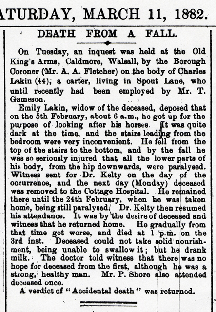 While researching this post I referred to the excellent website of Tony Hitchmough – longpull.co.uk that includes details of all Walsall pubs past and present and came across an interesting item. In March 1882 an inquest was held at the Old King’s Arms concerning the death of 44 year-old Charles Lakin, a carter who lived in Spout Lane who fell downstairs and subsequently died from his injuries. A copy of the newspaper report is shown below. Being interested family history many names ring bells but this one rang louder than most, I knew that name. Sure enough, checking my wife’s family tree I came across a Charles Lakin who turned out to be the great-grandfather of our sister-in-law.
