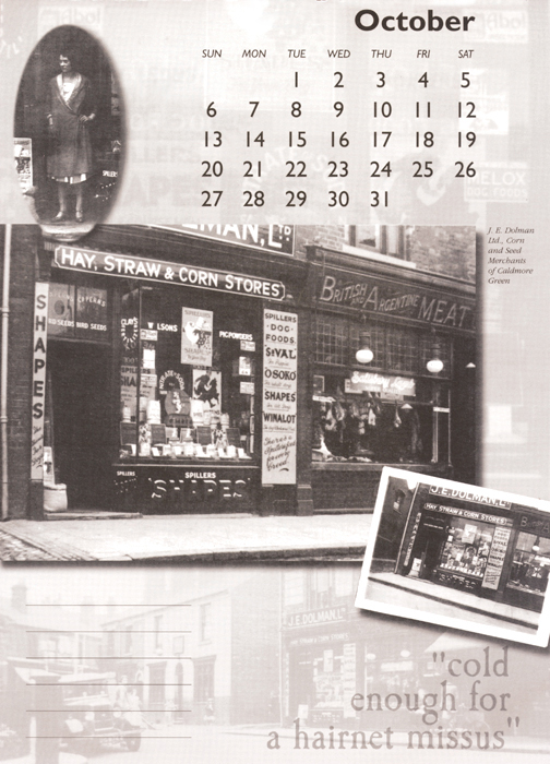 Continuing down Caldmore Road, back to the Green, in the 1950s/60s I can remember Breedons Electricals where we had our first tele’ from in 1957, that shop was just a bit further down, past the far shop with the blind down in the picture above. Past Carless Street were some shops and one I am sure housed a cake shop and another was the bike shop of Benny Parkes, I think that was his name, which always had a strong smell of rubber about it. Somewhere around here was the grocers shop of Pearks although I can’t recall exactly where. Rounding the corner, opposite the Green itself was Lycetts shop who sold watches and jewellery and next door was the Bakers Inn, and then J. E. Dolmans the corn and seed merchants. The Caldmore branch was managed by the formidable Elsie Evans, a lady who did not suffer fools or little lads gladly. In 2002 I featured J. E. Dolmans Ltd. in my Walsall Lives calendar and the October page from that year is shown below. Note the vignette in the top left of young Elsie Evans, I can hear her now……“am yo’ kids gunna’ buy anythin’, if not bugger off”……and she meant it! My Grandma’ used Dolmans to buy the feed for her chickens and knew Elsie well, one cold morning in winter my Gran’ walked in and commented to Elsie how nippy it was, Elsie replied in her deep gruff voice “are, it’s cold enough for a hairnet missus!”