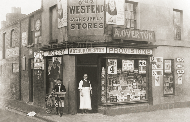 In 1915 my Gran’ was new to living in Caldmore but my Grandfather probably knew “cracks in the pavement” as had lived there since his birth at 16 Caldmore Road in 1882, see my earlier post titled Moseley family of Caldmore Road to learn more about them. The picture of Caldmore Green, focusing on the White Hart, is dated 1915, so this is the Caldmore of my newly wed grandparents. The buildings in the distance, above the chap in the pony and trap on the far right is where Poppleton’s shop used to be. The other cart shown is for the ‘oss drawn carriers of T. Harris. Unusually there is a “copper” in the picture with the not so unusual group of inquisitive kids. Another store popular to the newly weds was that of Arthur Overton whose West End Cash Supply Stores stood on the corner of Sandwell and Newhall streets, his delivery lad, “our Granville” poses proudly with his bike!