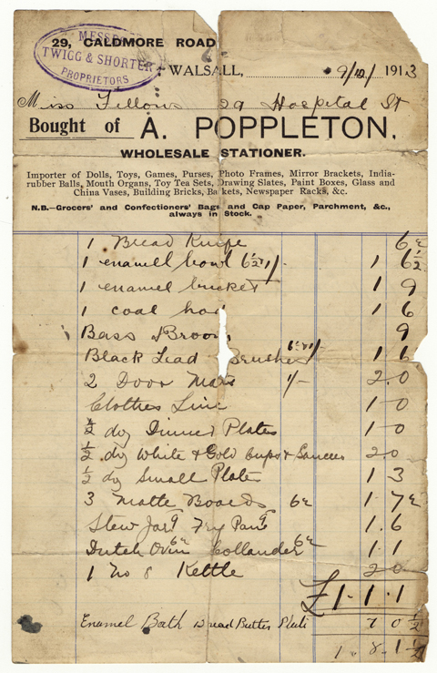 Things were much different 101 years ago, see my grandma’s bill from A. Poppletons at 29 Caldmore Road and look how much she purchased for £1 8s 1.5d (approximately £1.40p in decimal currency) in 1913. Prior to her marriage my Gran’ was Lizzy Fellows who lived in Hospital Street with her parents and nine siblings, she worked in Caldmore at The Summit buckle works in New Street, opposite Dandy’s Walk.
