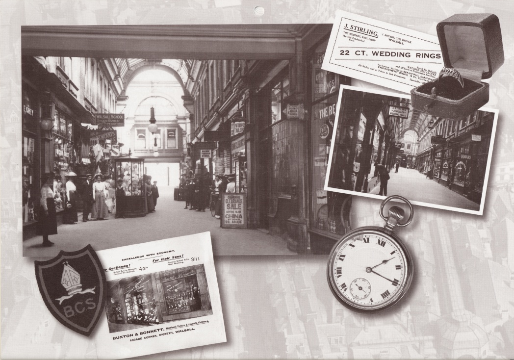 Many well-known businesses have occupied the shop units over the years and two of them that still trade today are featured: Buxton and Bonnett, the outfitters, and J. Stirling, the jewellers. The former company has occupied the corner premises at the Digbeth entrance since The Arcade opened, trading, as the 1904 advertisement says, as ‘Merchant Tailors and Juvenile Clothiers’. As well as supplying gents clothing, the shop maintains its reputation as being a popular choice with parents for school uniforms, including the ancillary items like the Blue Coat badge shown.