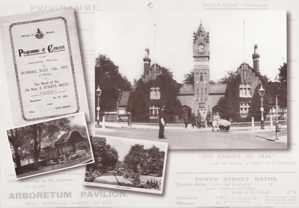 Since the opening in 1874, when you had to pay to stroll through this oasis of greenery, the Arbo’ has been a playground for thousands of Walsall children and the setting for numerous family days out. The bandstand shown in the smaller photograph was the second to be erected and was opened in 1924; in its heyday it housed many famous military bands from all over the country. The programme cover shows the visit of the South Staffordshire Regimental Band in 1925, and in the background is the centre spread from the same programme showing the advertisements for the Arboretum Pavilion and Tower Street Baths.
