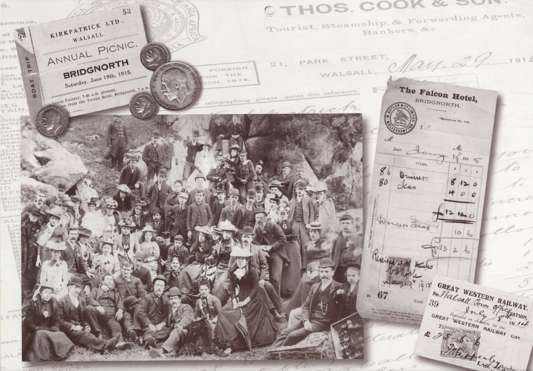 Two additional items illustrated show details of the trip to Bridgnorth in June 1915, booked through Thomas Cook and Sons of 21 Park Street. The coins on the page, a ‘two bob’ piece, a ‘tanner’ and two silver ‘threepenny bits’ show the fare of ‘three bob’ for the employees; guests had to pay double that price for the privilege.