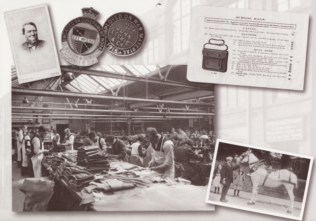The main photograph, taken in the 1930s, shows the department that manufactured school bags and satchels and is accompanied by a page from the 1934 catalogue for those products.