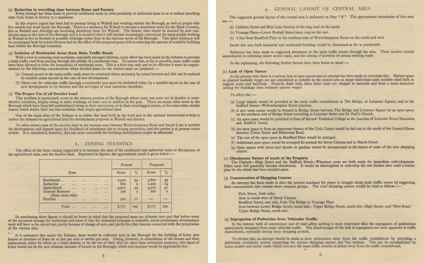 Page 5 below continues the text from page 4 titled General Zoning. Article 8 titled Zoning Statistics on page 6 gives a table of acreage for various types of land, residential, industrial etc. I particularly like the final item, Derelict and the “Proposed” column, it contains a hyphen……..does that mean zero? If so, that’s one they got wrong!