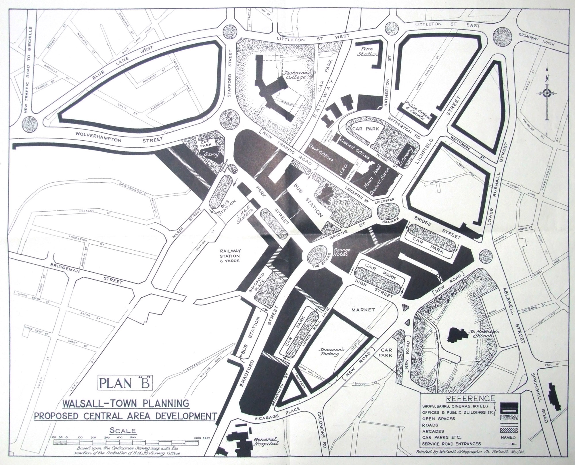 Reproduced below is the Plan B map which concerns the redevelopment of the town centre. The ideas put forward were quite radical in places, although many street names remain their configuration would be changed considerably in some cases. A new road, not a million miles from the new road opened a few years ago around The Ditch area, was due to be built, Peal, Dudley and Upper Rushall Streets would all have gone under these proposals. In the building of this road Freer and Goodall Streets were to be erased from the map completely and replaced with an area that would house banks, shops and hotels etc, as well as two large car parks! Shannon’s factory remained and so does the market but not as we knew it (note the past tense). The market would have been housed just OFF High Street on the area now occupied by George Street. Interestingly both the George Hotel and the Savoy Cinema remained as part of any future development. Of course we now know different! Note the inclusion on the plan of the “new” Technical College which lasted approximately fifty years and the site is now occupied by Tesco.