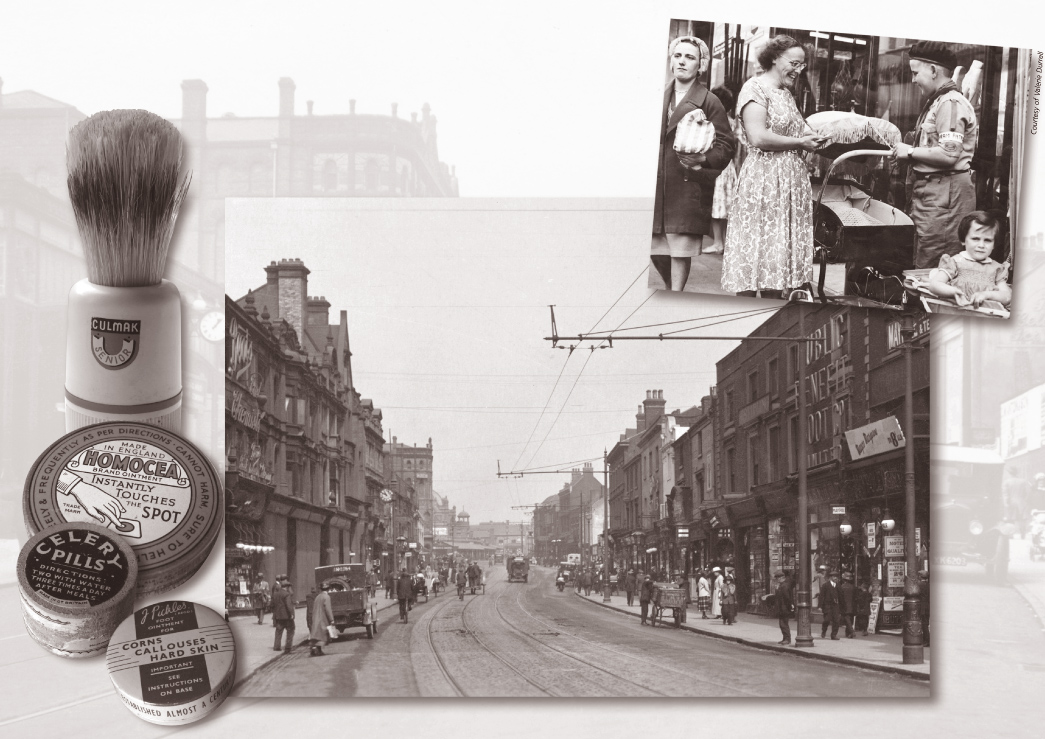 On the extreme left of the picture is Boots the Chemists, where all of the items on the left could be purchased. Homocea Ointment for ‘all little skin troubles’ it says on the tin; Celery Pills used as a pain reliever since 30A.D. and for those stubborn corns and callouses why not give J. Pickles Foot Ointment a try?