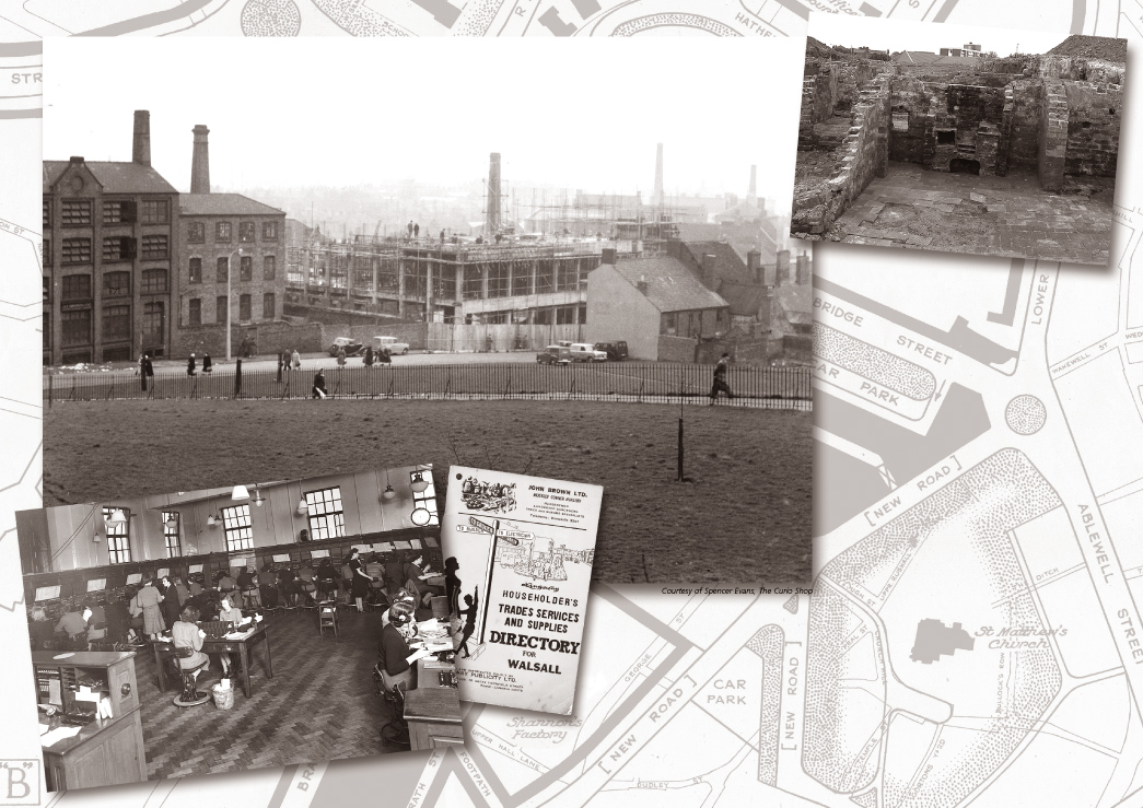 The main photograph shows the construction of the new telephone exchange (entered from Goodall Street) and Inland Revenue offices on the corner of Upper Bridge and Upper Rushall Street in the early 1960s. Below that picture is a shot of the Walsall Bridge Central Exchange circa 1950 at its base above the Post Office in Darwall Street.