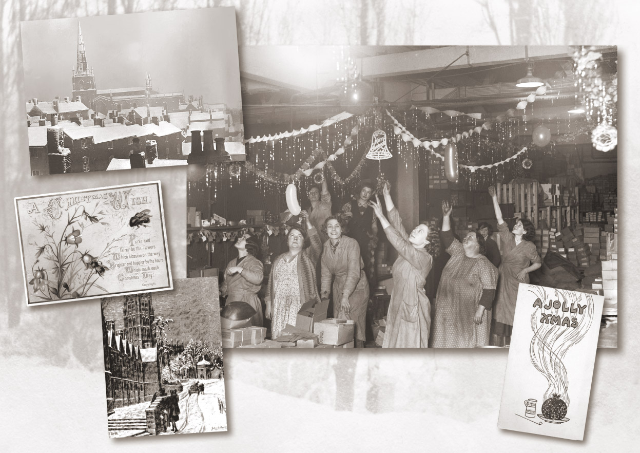 The three Christmas cards displayed are from different eras. The card with a look of springtime about it was sent to a Walsall family around 1895 and the smaller card in the bottom right was sent by Mr and Mrs Lees of Camden Street to friends at Christmas in 1908. Finally, a personal card from John and Gwendolen Crabtree sent during the 1930s. John as well a being a very successful businessman, economist and engineer was also a talented artist and cartoonist and for many years illustrated his own Christmas cards and many other publications.