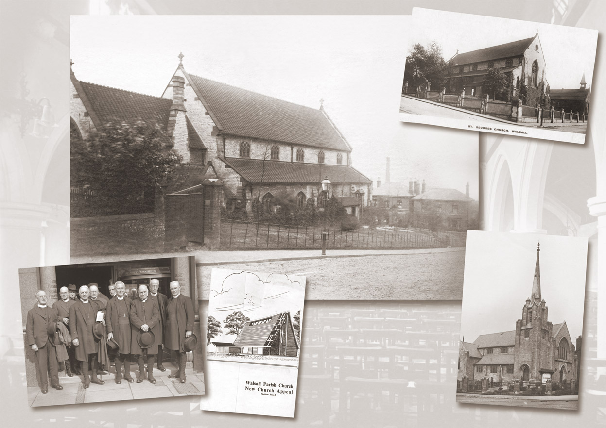 The main picture above shows the now demolished St. George’s Church around 1900 taken from an unusual viewpoint, looking down Walhouse Road to its junction with Persehouse Street. The more usual view of the church can be seen in the postcard from the 1950s in the top right corner.