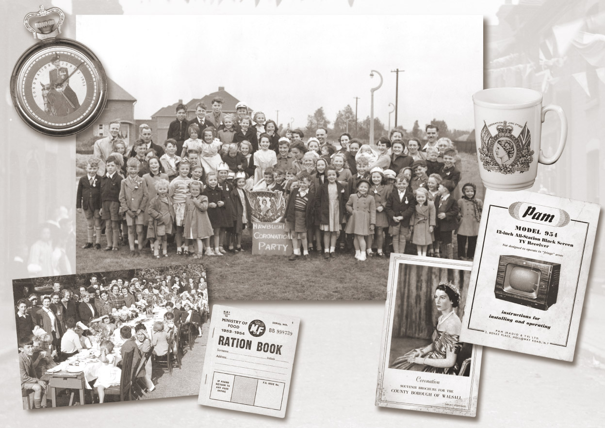 The booklet in the bottom right on the page above shows the official brochure issued by the Council to honour the occasion. Walsall, like everywhere else in Britain, had its own itinerary of events that included concerts, parades, military displays, motor rallies and sports meetings which began on 20th May and continued until 14th June. On the day itself a concert by the band of the South Staffordshire Regiment was held in the Arboretum and in the evening, at the same venue, open-air dancing took place with music from Clive James and his Orchestra, followed by a firework display at 11.00pm. At the Town Hall a Coronation Ball was held in the evening with dancing to Hedley Ward and his band.