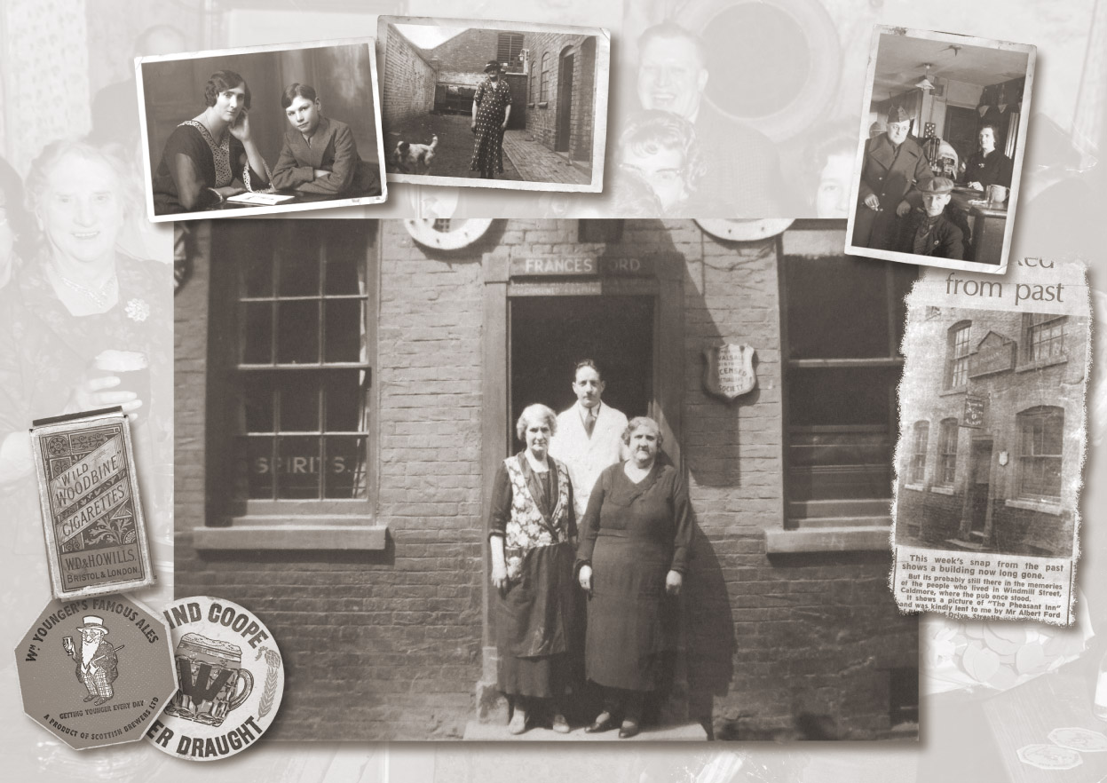 The smaller picture top left shows a much younger Mrs Ford with her son Albert, his mother died in 1977 but he is still going strong at the age of ninety-four. The other smaller picture shows the backyard and the side of the building complete with Mrs Ford’s mother and the family dog. In the top right is a picture of the bar with “Florrie,” regular “Foggy” Wilson and an unknown serviceman; note the gas mantle still in the ceiling. Below that is a well-worn newspaper cutting and is one of the few pictures that shows the full frontage of the pub.