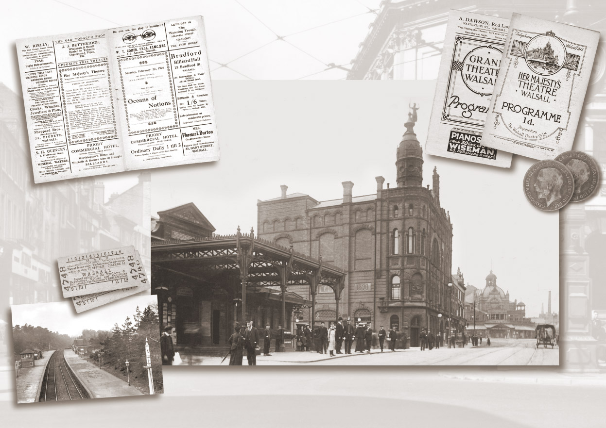 Also included in the picture are Walsall’s two most famous theatres, The Grand and Her Majesty’s. At the top right of the picture is a programme from each theatre both dated 1926….. and “tuppence” for the two. In the top left corner is a double page spread from Her Majesty’s Theatre programme showing the evening’s entertainment, “Oceans of Notions” which was shown twice nightly. The Grand Theatre which stood on the corner of Park Street and Station Street was first called the Alexandra Concert Hall in 1873, six-years later it was known as the Alexandra Theatre then the Gaiety, finally opening as The Grand after a rebuild in 1890. By 1931 it had been converted to a cinema and eventually burnt down in 1939. Her Majesty’s opened in 1900 and became a variety theatre in 1905. Two years after The Grand became a cinema Her Majesty’s followed. The building shown in the picture was demolished in 1937 and a year later it was rebuilt and opened as The Savoy cinema. The cinema was demolished in the mid 1990s and Woolworths took over the site in a new building that was influenced by the architecture of the original theatre. The site is now occupied by T. J. Hughes.