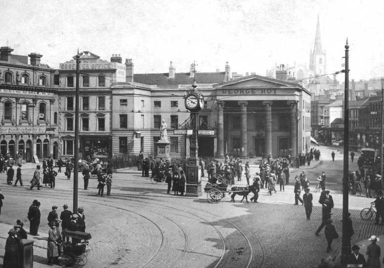 The daytime image left is of similar vintage to the nocturnal shots above shows the view looking towards the statue and George Hotel and Sister Dora’s statue.