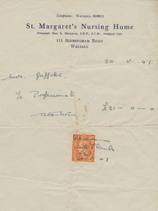 I was born in May 1947 after one of the most severe winters Britain had seen in many years. The date set for my birth was 20th April ’47, but my mother had other ideas. Dr. Abdul Hadi, mom’s doctor, had to go away and my mother said “I’ll wait for you to get back before I give birth”, such was mom’s trust in Dr. Hadi, who replied, “I don’t think so Mrs. G!”. Dr. Hadi went away and came back nearly three weeks later, mom, true to her word was ready. Twenty days after the original due date I came into to this world at around 3.50 a.m. weighing almost ten pounds. This birth was of course pre NHS and I cost money to bring into this world, below is the invoice from St. Margaret’s Nursing Home. I don’t think Walsall FC were paying that much for players back then…..some say nothing has changed!