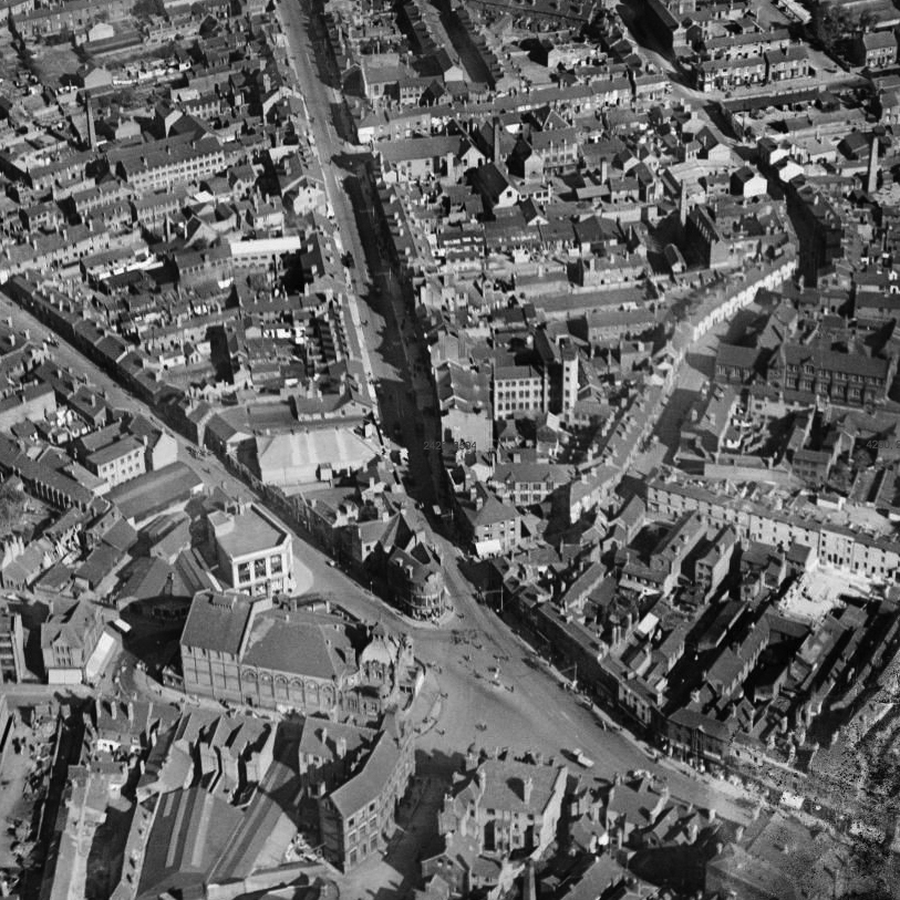 An aerial view of the Wisemore and Town End taken in 1928. Her Majesty’s Theatre can be seen towards the bottom left of the picture, also in the far right lower corner is the Grand Theatre. The Wisemore Schools are half way up the picture on the right. (Taken from Britain From Above, http://www.britainfromabove.org.uk/)