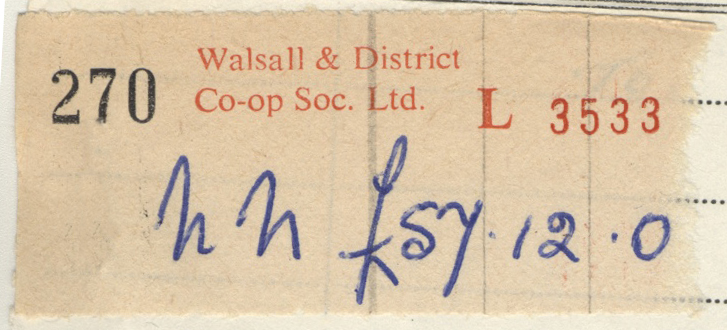This popular photograph shows the milkmen of the Co-op posing with their trusty steeds outside the main offices and store in Upper Bridge Street in the 1930s.The familiar stub from the Walsall & District Co-op. Not one of my Mom’s sadly, you could get some divi’ off 57 quid!